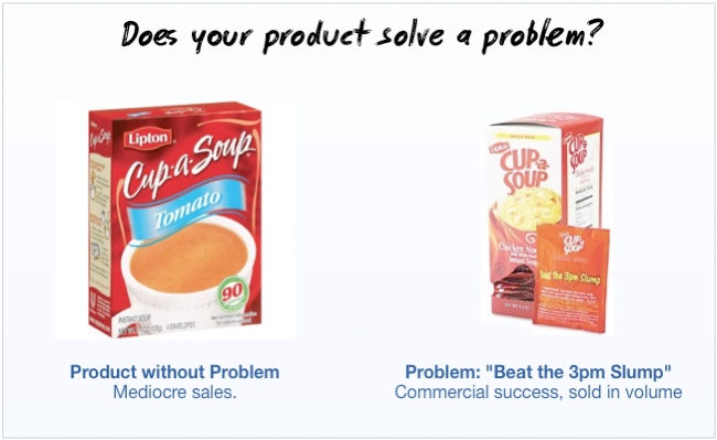 If you pair your product perfectly with the problem that it solves, then the role of marketing shifts from generating demand down to generating awareness. You no longer have to convince people that they want your product. You just need to help them decide that yours is the best one. In the example above, soup companies found that simply pitching “cup a soup” wasn’t working as there weren’t too many occasions that people felt they had a problem that it would solve. By advertising it against a daily problem (that is, a slump in productivity in the afternoon), they saw an immediate increase in sales. People had that problem every day, and now they had a product saying it could help them.